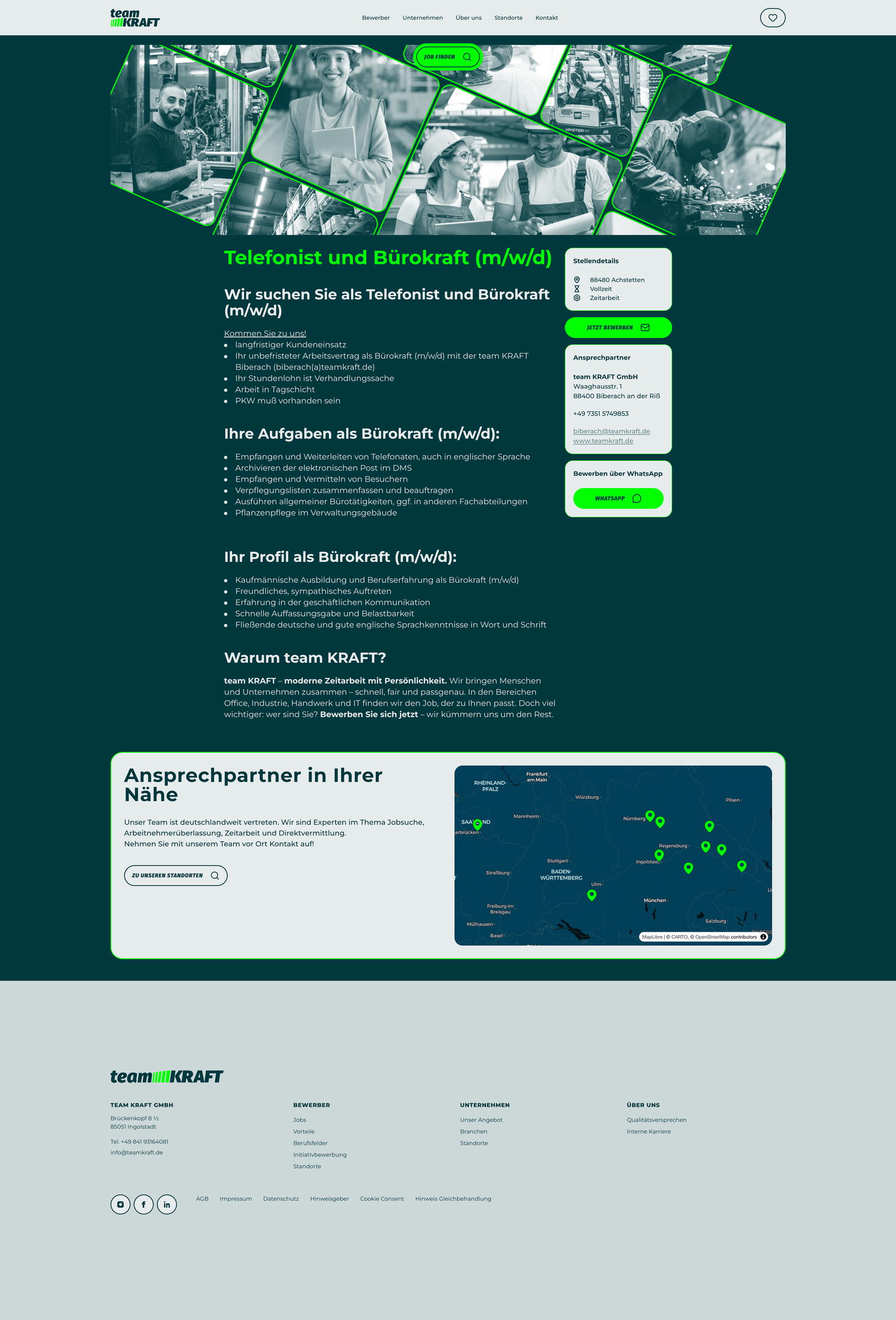 Die neue Website positioniert team KRAFT klar als moderne Zeitarbeitsfirma – mit einem Auftritt, der das Unternehmen von der Konkurrenz abhebt. Der Job Finder sorgt dafür, dass Bewerber sofort finden, was sie suchen. Die SEO-Optimierung schafft nachhaltige Sichtbarkeit für relevante Suchbegriffe rund um Zeitarbeit und Personalvermittlung. Talent 360 läuft vollautomatisch im Hintergrund – ohne manuellen Pflegeaufwand.