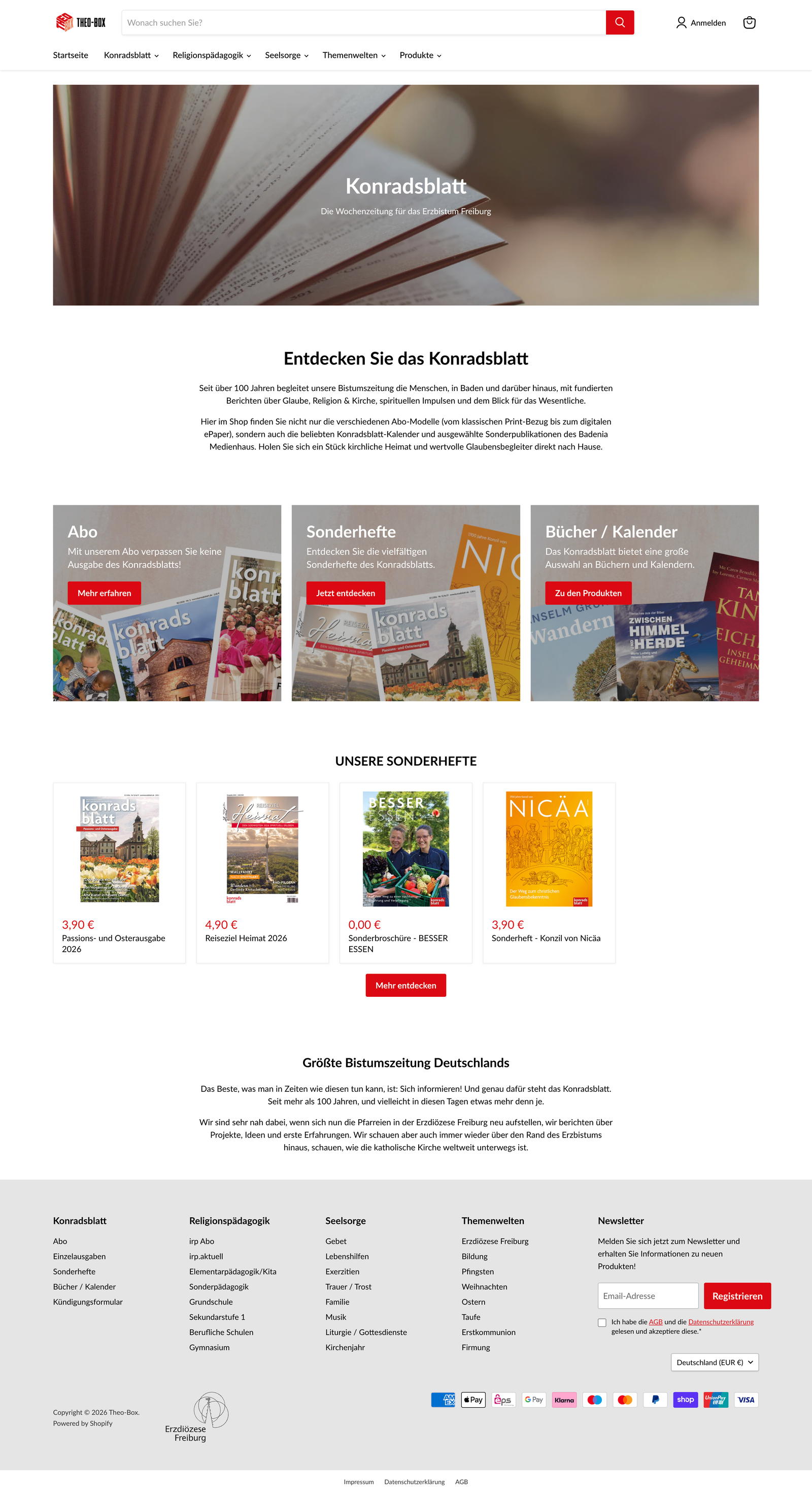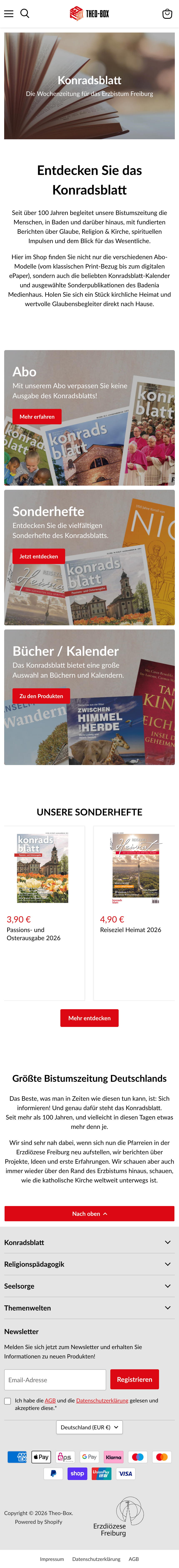Theo-Box vereint die Angebote des Badenia Medienhauses, des Instituts für Religionspädagogik und des Seelsorgeamts der Erzdiözese Freiburg in einem zentralen Online-Shop. Dafür haben wir in einem Markenworkshop den Namen, die Marke und das Logo entwickelt, das E-Commerce-Konzept in einem Lastenheft erarbeitet, das Screendesign neu gestaltet und den Shop auf Shopify umgesetzt – inklusive DATEV-Schnittstelle.